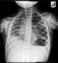 Her follow-up CXR is shown below. It shows a shrinking right lung with continued bilateral opacifications.