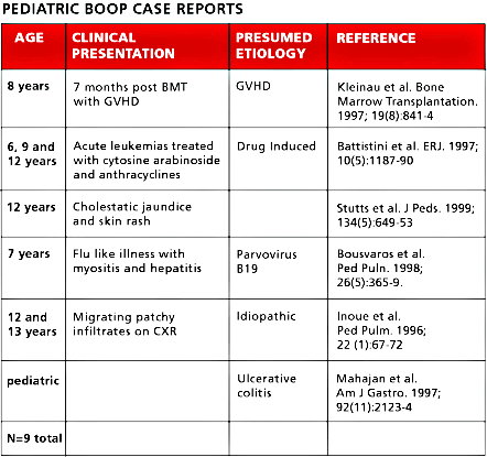 The small amount of pediatric literature on BOOP, and our own center experience with BOOP, does not support the good prognostic, steroid responsive picture associated with this disease in adults.