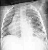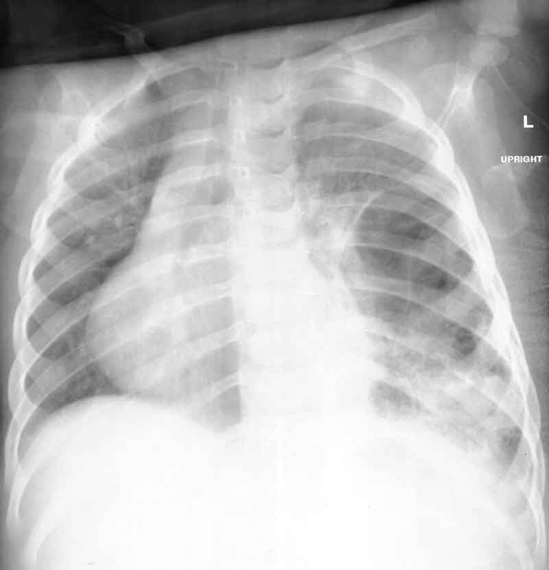 The girl was moderately distressed, with a respiratory rate of 60/minute, an oxygen saturation of 88%, and decreased breath sounds on left side.The