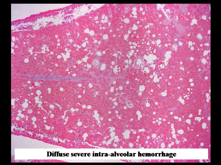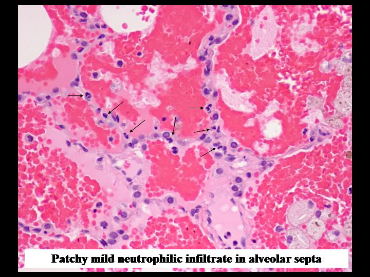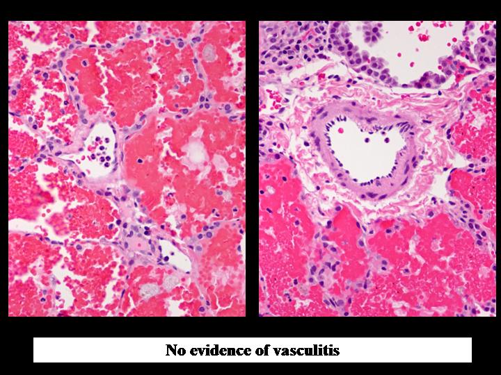 Sections show architecturally normal lung with diffuse severe intra-alveolar hemorrhage. Collections of foamy macrophages containing hemosiderin granules in their cytoplasm are present in the alveolar spaces. There are focal areas of intra-alveolar fibrin deposition, organization and fibrosis. The alveolar septae contain a mild focal infiltrate of neutrophils consistent with a mild capillaritis. Small intralobular arterioles, arteries and larger interlobular arteries show no evidence of vasculitis. The alveolar epithelial lining is intact, but shows focal type 2 pneumocyte hyperplasia. There is no evidence of hyaline membrane formation. No granulomas identified.