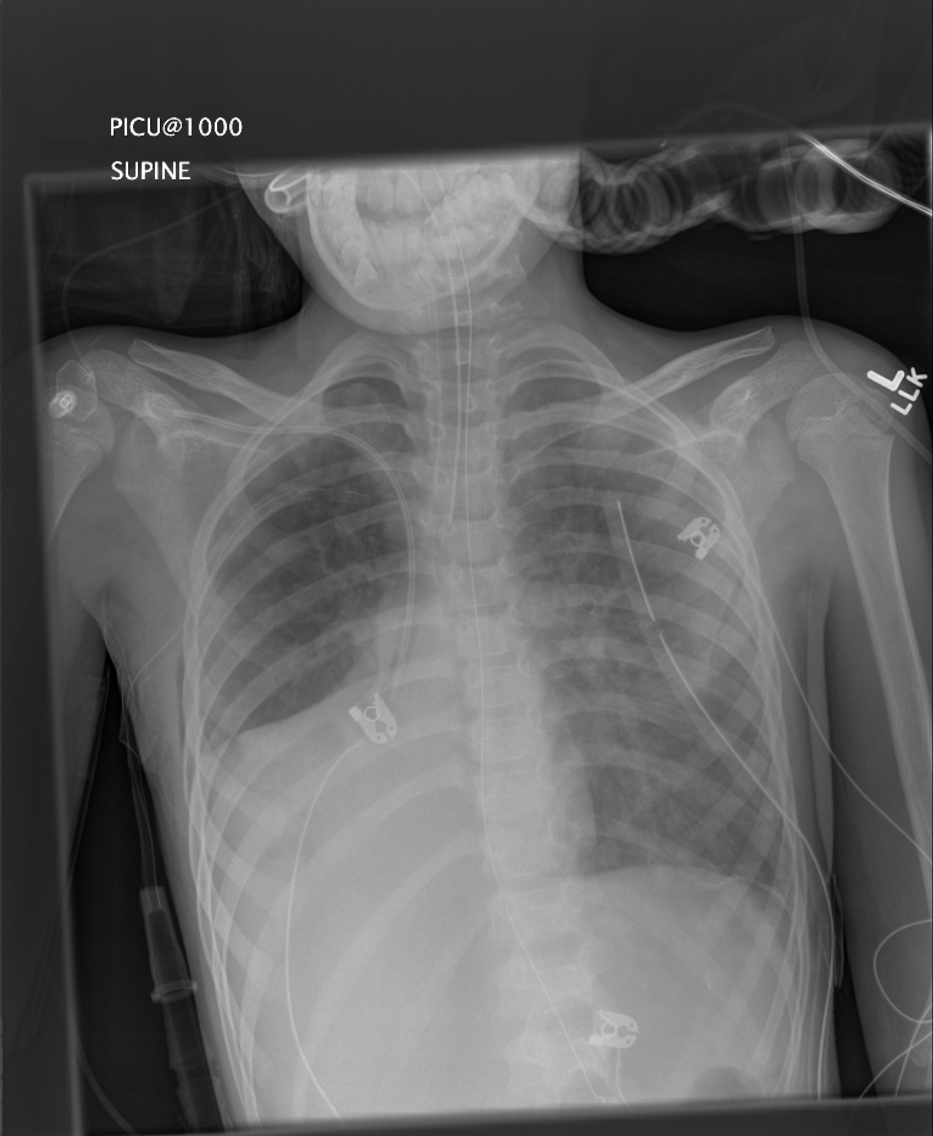 On day 20 he developed right sided atelectasis. His pressures increased to 33/15 and FiO2 to 0.85. The PICU consult the chest team regarding bronchoscopy in the morning.
