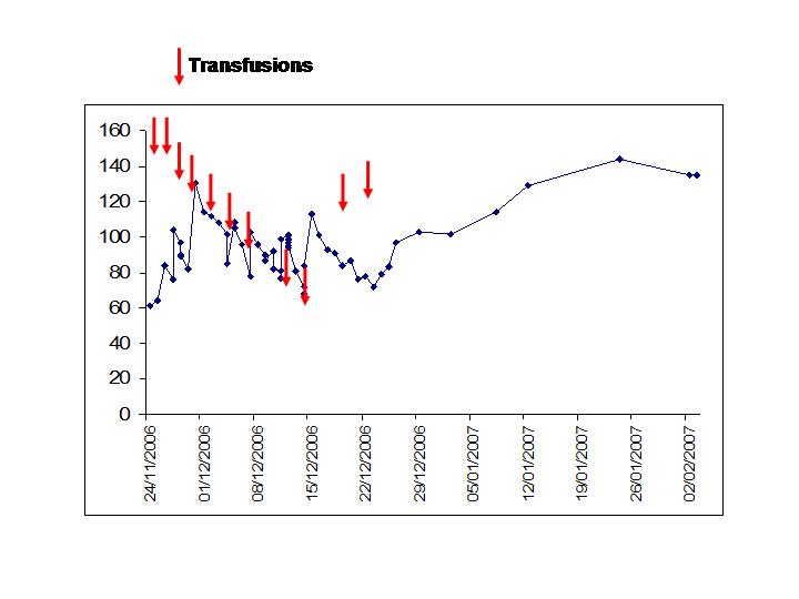 Approximately, a month after his first dose he had cyclophosphamide again. Despite adequate hydration he developed hemorraghic cystitis. Further monthly cyclophosphamide treatments were uncomplicated and the aim is to complete a 5-6 month course. His Hgb stabilized at a reasonable level and his CXR remained clear.