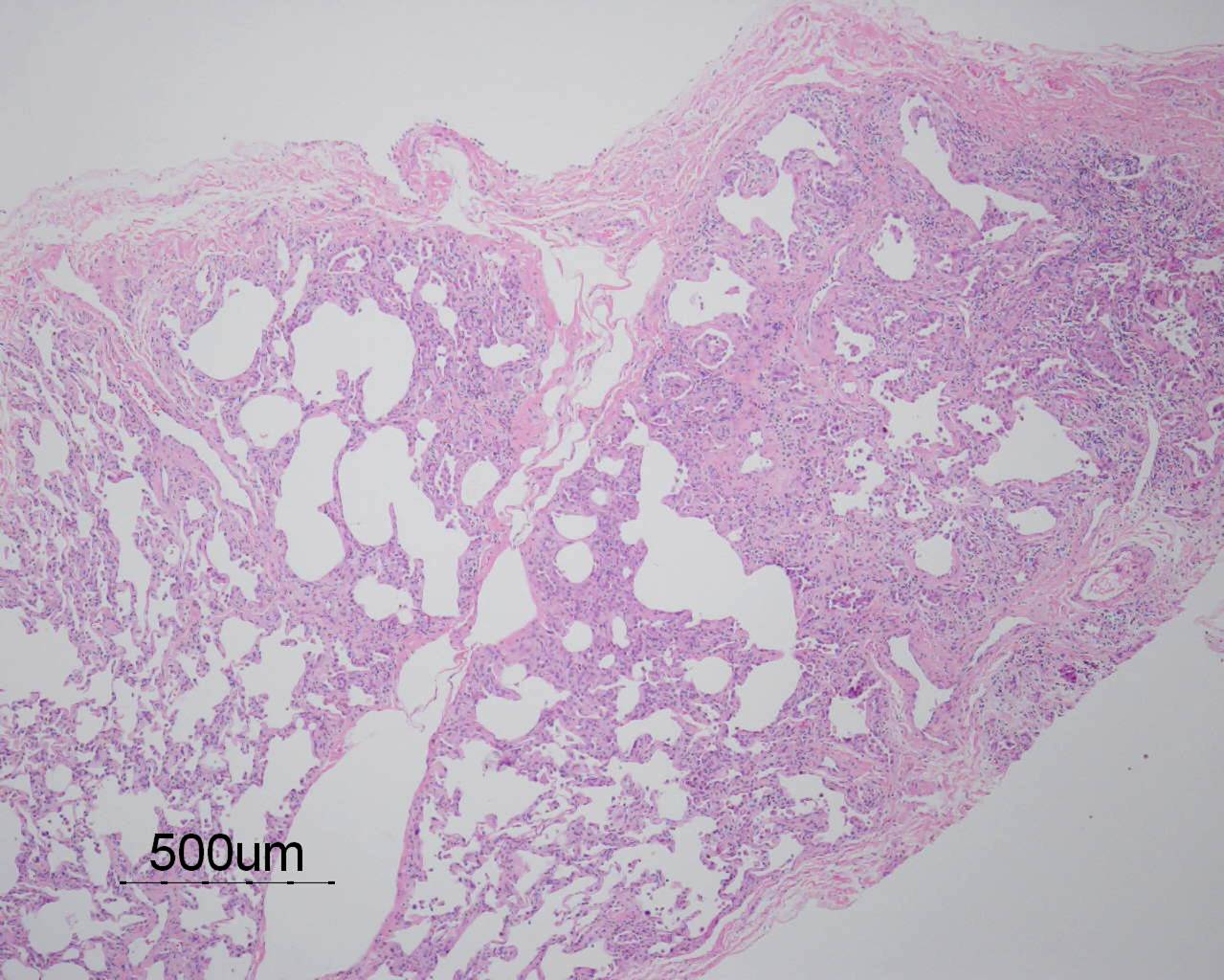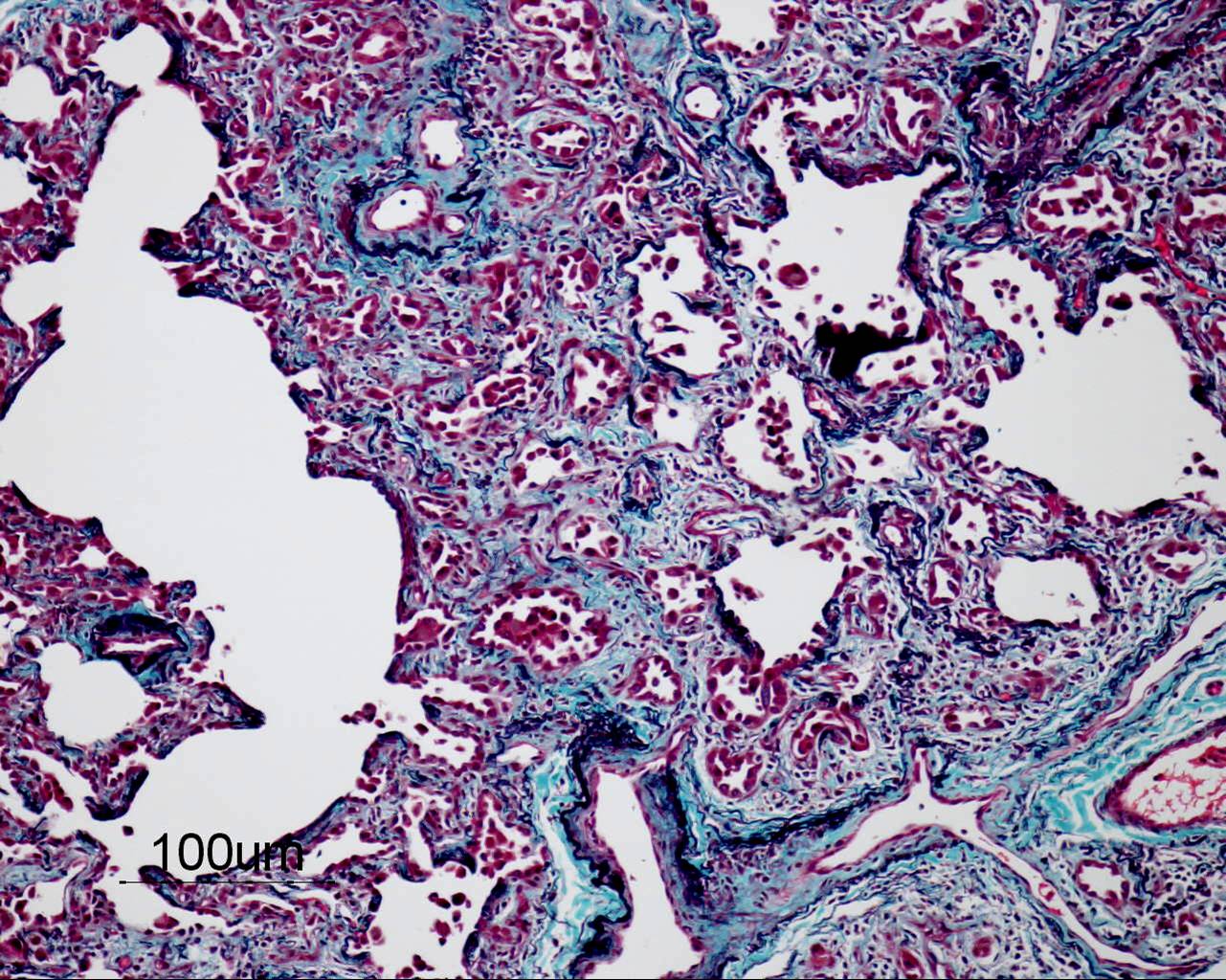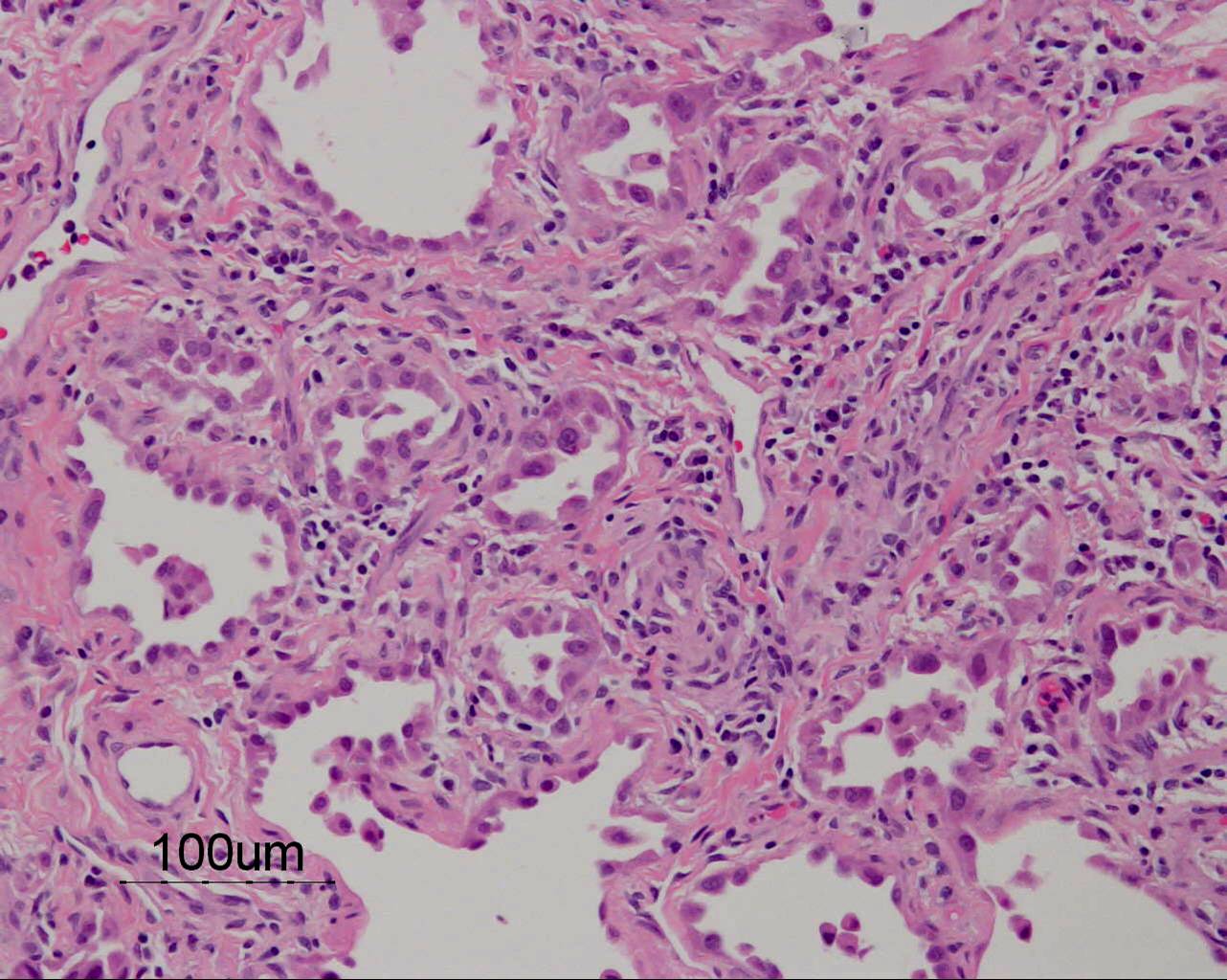 Based on the information found on the CT of the chest, LF underwent an open lung biopsy which showed usual interstitial pneumonitis (UIP) as demonstrated in the pathology below: