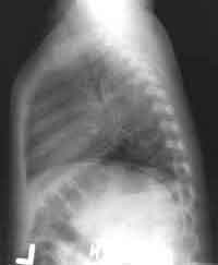 At 9 months of age, he was again admitted with a wet cough, fever, and dyspnea which was again unresponsive to salbutamol. Nasal cultures were positive for RSV. He received sabutamol, oral dexamethsone, oxygen, and chest physiotherapy. Following this last admission, the patient had constant coryza, a harsh wet cough in the evening, and yellow or white sputum production. He had a few episodes of dyspnea and cyanosis. He had 3 hard stools per day.