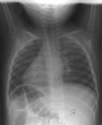 At 6 months of age, he was re-admitted to PICU with severe wheezing, dyspnea, and right upper and left lower lobe atelectasis. He received cefuroxime and clindamycin. Blood and viral cultures were negative.
