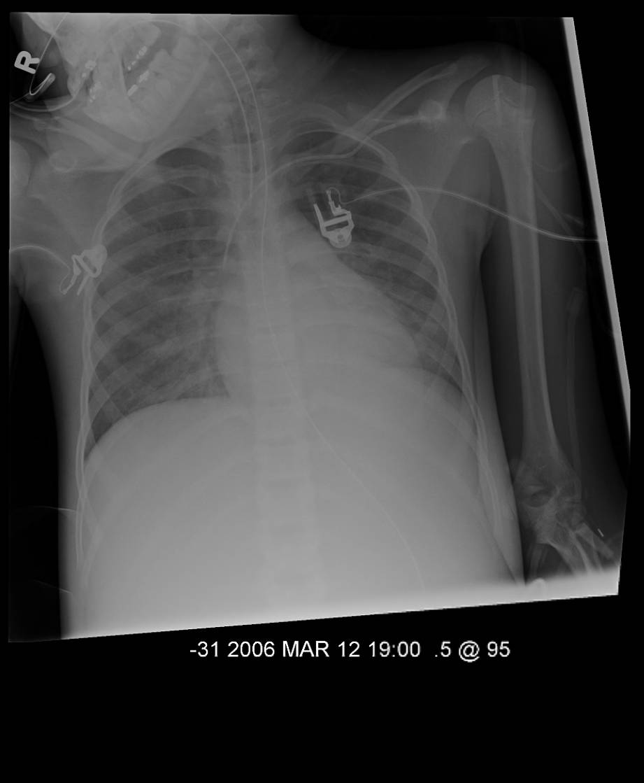 The respiratory status remained stable until Day 15 at which point she required increased ventilatory pressures (peak inspiratory pressure of 33 cm H20 and a PEEP of 12 cm H2O) and a FiO2 of 0.50. Her arterial blood gas was: pH 7.27; pAO2 73.5; pCO2 53.4; A-a gradient of 255.